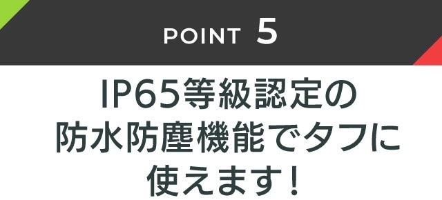 A5 : 対応しています。IP保護等級のIP65を取得済みです。IP65では、「埃の入りにくさ」 は、「塵埃の侵入がない」です。IP65では、「水の入りにくさ」は、「あらゆる方向からのノズルによる噴流水機器が影響を受けない」です。5以上があれば通常の使用では十分です。