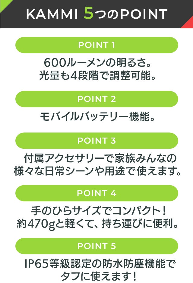 【KAMMI】は、モバイルバッテリー機能付きの軽量&コンパクトなLEDライトです。多彩なアクセサリーで、日常時も、防犯防災時にも役立ちます!