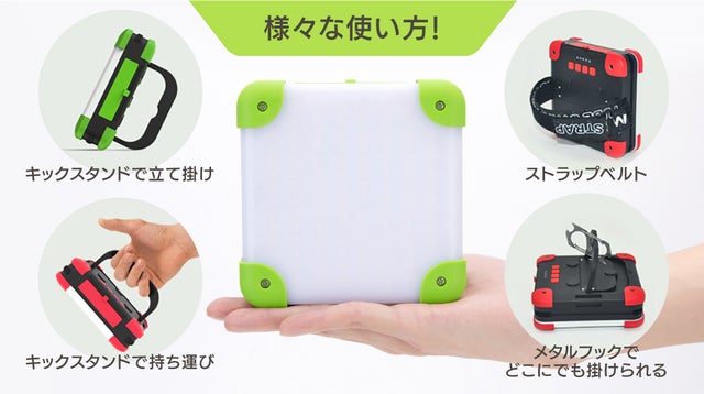 「キックスタンド」を手で持てば懐中電灯になり、また壁にフックで掛けられます。「キックスタンド」の角度は90度(直角)。
