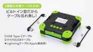A3 : ございます。内蔵型(ビィルトインタイプBuilt-in型)ケーブル式で本体と一体型。従いまして、USB Type Cケーブルを使う際、本体の側面から簡単に取り外すだけで、使用する事が出来、大変便利です。USB Type Cケーブルを本体に接続するだけでスマホ等への充電は、自動的に開始されます。