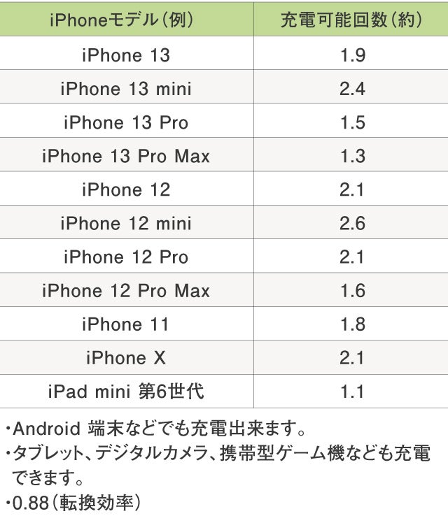 A9 : スマートフォンへの充電可能回数は、下記をご参考として下さい。