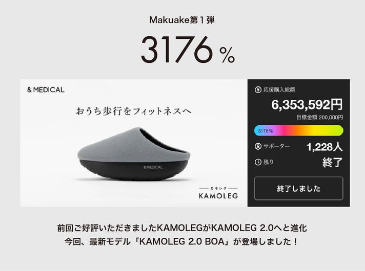 「Makuake(マクアケ)」は、実行者の想いを応援購入によって実現するアタラシイものやサービスのプラットフォームです。このページは、 プロダクトカテゴリの 「歩行をフィットネスに変える「KAMOLEG2.0」に秋冬ボアモデル登場」プロジェクト詳細ページです。