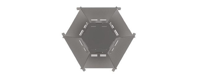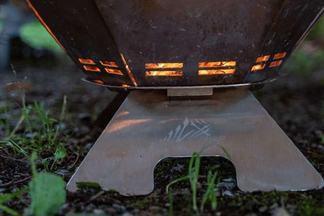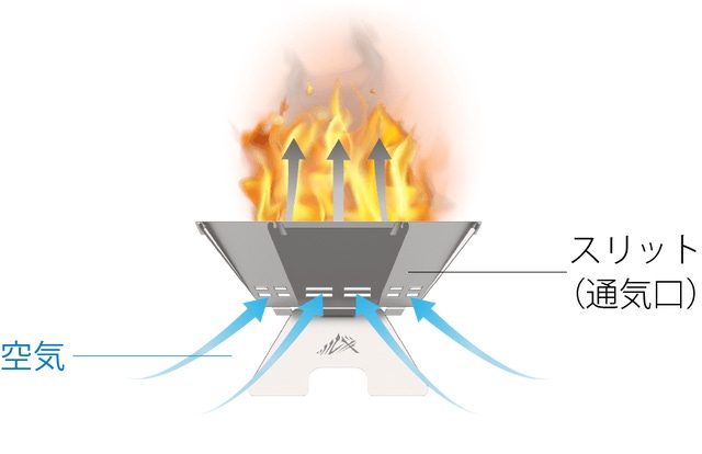 熱によるプレートの変形を抑えるためスリット(通気口)の形状もこだわりました。軽量化と強度のバランスを考えたトラス構造となっています。(トラス構造とは部材同士を三角につなぎ合わせた構造形式です。)また、焚き火の熱を脚部に伝わりにくくする効果もあります。細やかな機能設計から導き出された、無駄のない洗練されたデザインとなっています。