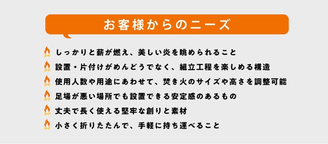 上記のご要望すべてにお応えし、焚き火の楽しさが味わえる焚き火台「炎奏(KANADE)」を開発しました。初めて焚き火台を選ぶ初心者キャンパーの方はもちろん、今までいくつもの焚き火台を経験し、新しいスタイルをお探し中の上級者キャンパーのみなさまにも手にとっていただきたい。当社が自信をもってご紹介する、こだわり尽くした焚き火台です。