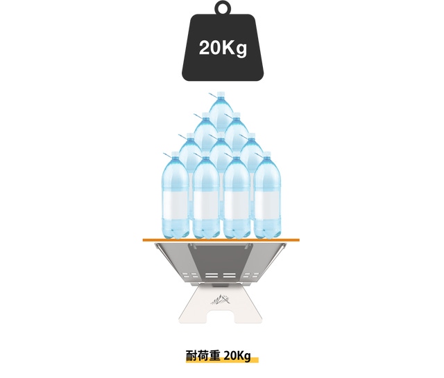 架台の耐荷重は20kg。2Lのペットボトル10本分に相当します。たっぷり水のはいったヤカンはもちろんのこと、一般的なダッチオーブンも余裕で置くことができます。大人数用のヘキサタイプ、ソロ用のスクエアタイプいずれの場合も耐荷重は変わりません。