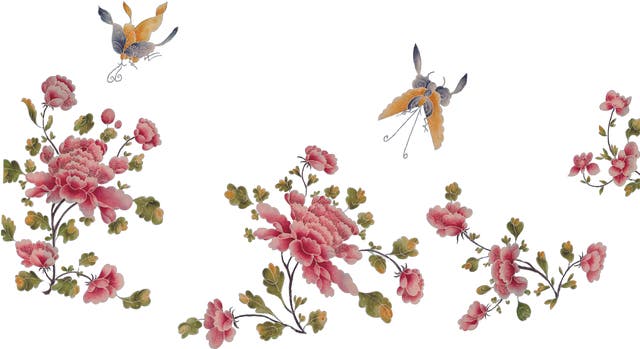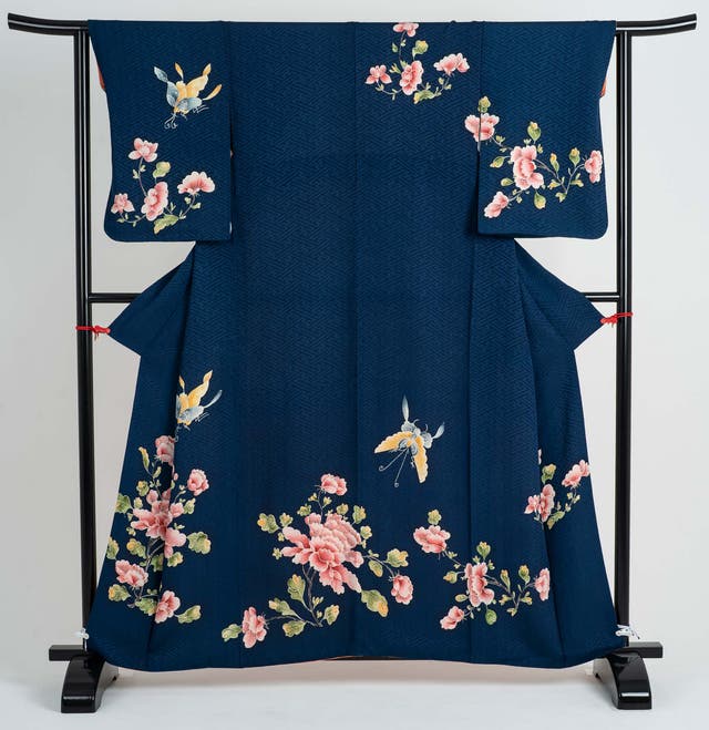 丁寧に描かれた中華風の薔薇と蝶。まるで清朝の西太后が好んで身につけた華麗な衣装から抜けだしてきたかのような、凜とした気品のある絵柄です。おそらく、戦前につくられたこの着物。戦後は西洋風の薔薇が多く描かれてきたため、中華風タッチの薔薇の柄は珍しく貴重です。
