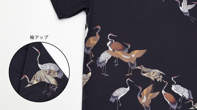 優美、かつ貫禄すら感じさせる鶴が、堂々と描かれています。現代風にアレンジされた絵柄は、捺染(プリント)機械によって独特な風情でいきいきと表現され、手描き友禅とは異なる新しい魅力を発しています。