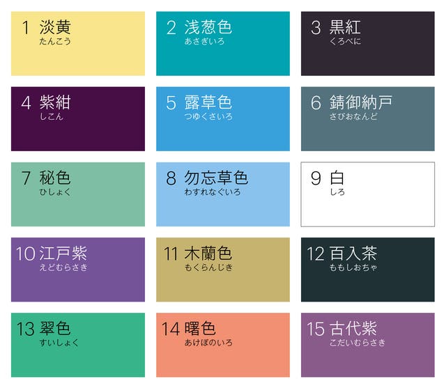 ⑭曙色(あけぼのいろ)⑮古代紫(こだいむらさき)