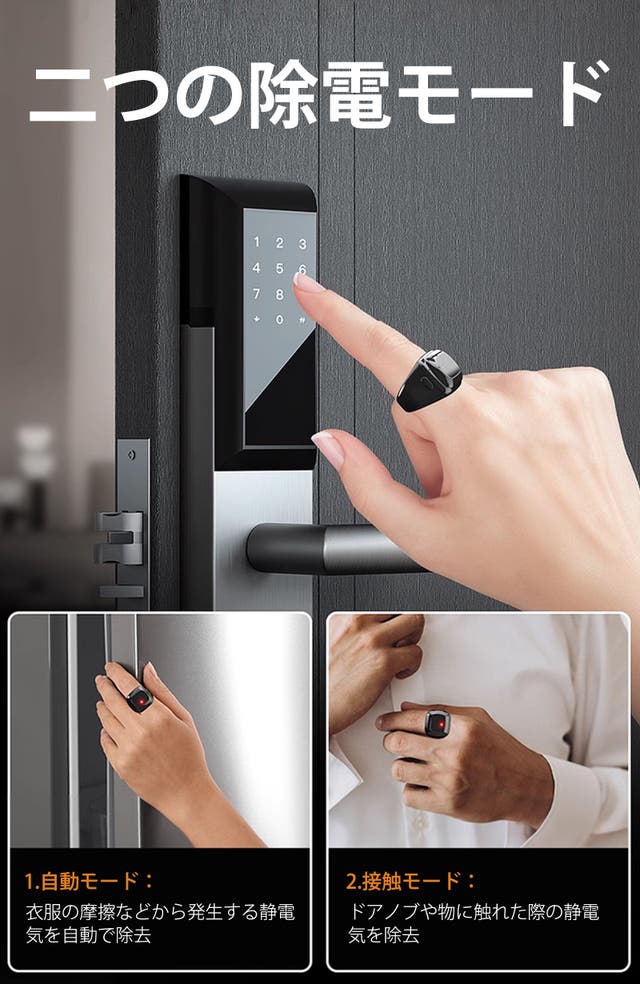 A:このリングは、指に装着するだけで自動的に静電気を除去します。特に冬の乾燥した環境や衣服を脱ぐ際、ドアノブに触れる際などに効果を発揮します。手動モードでも静電気を放電できます。