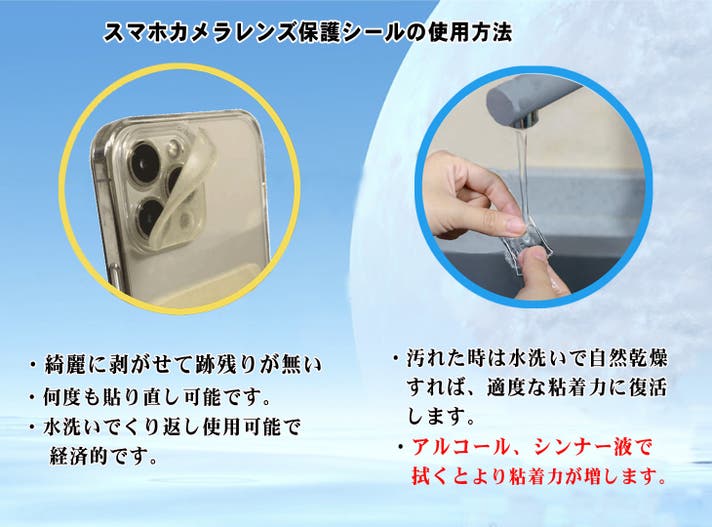 - レンズ保護シールは洗って繰り返し使う事が出来ます。