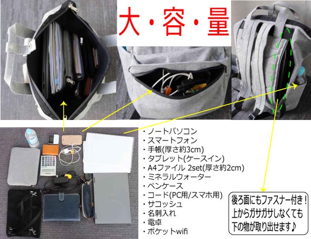 敢えて仕切りは無し。口も大きく開くのでたくさん楽に入ります♪ (内側に計4つのポケットは付いていますので、スマホや名刺入れ等はスッキリ収納可!)サイドポケットはペットボトルがスッキリ収納!