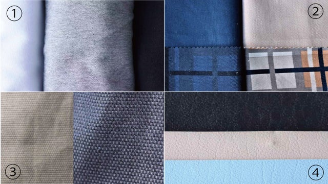 ③超軽量カポック混OX ④ライトウェイト合成皮革