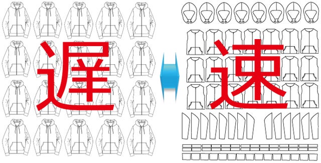 パーツ生産は1枚服より比較的スピードが速いので、見込み生産を極力抑えて過剰供給(=無駄)の減少につながります。(特に追加生産において)