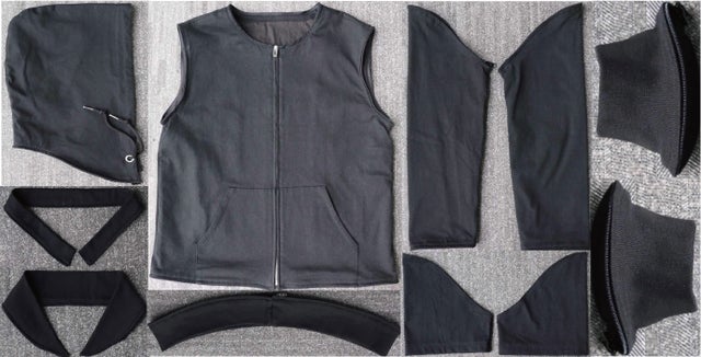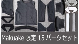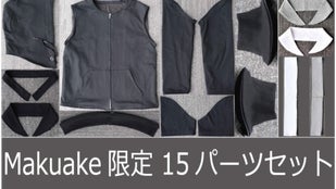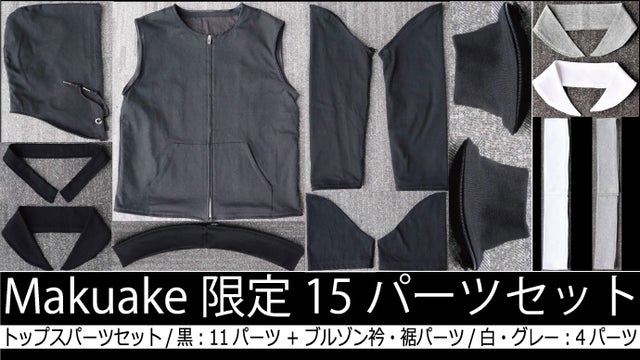 トップスパーツセット/黒 (全11パーツ)と衿・裾パーツ/白・グレー (全4パーツ)の合計15パーツをMakuake限定セットとしてご用意させて頂きました。