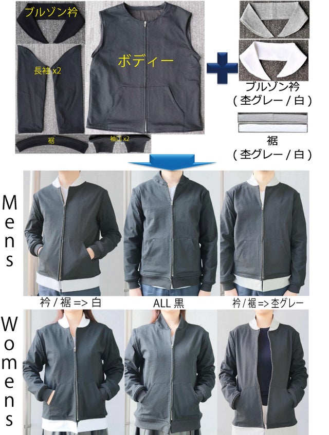 黒のブルゾン構成7パーツ(ボディー/ブルゾン衿/左右長袖/裾/左右袖口)に白とグレーのブルゾン衿と裾パーツを加えるだけで、配色スタイルが簡単に表現可能!
