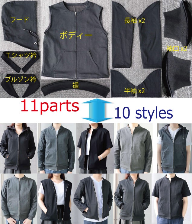 全パーツファスナー付。パーツ同士の「結合」で、様々なスタイルに自在に変化。例えば以下のパーカーのように。
