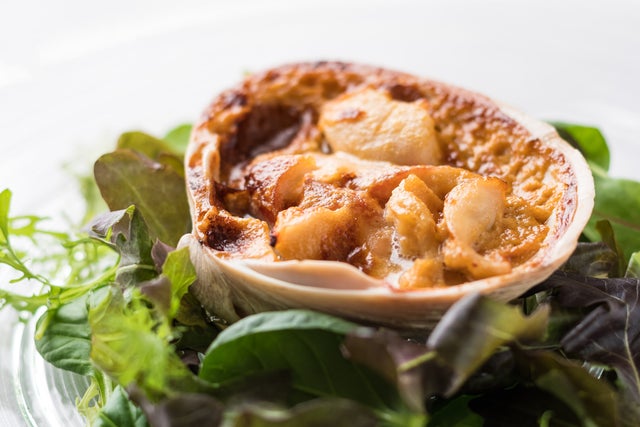 ・北海道産・鮑と赤牡丹海老、帆立のオーブン焼き サヴァイヨンソース