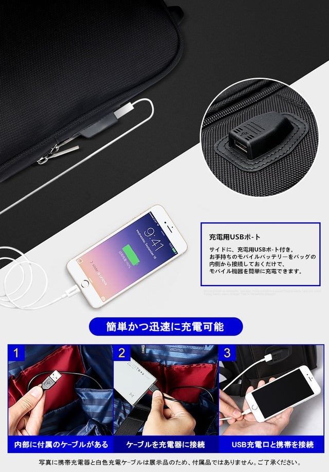 サイドに、充電用USBポ-ト付き。お手持ちのモバイルバッテリーをバッグの内側から接続しておくだけで、モバイル機器を簡単に充電できます。