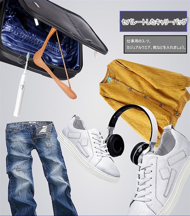 セパレートしたキャリーバッグには、仕事用のス-ツ、カジュアルウエア、靴などを入れましょう。