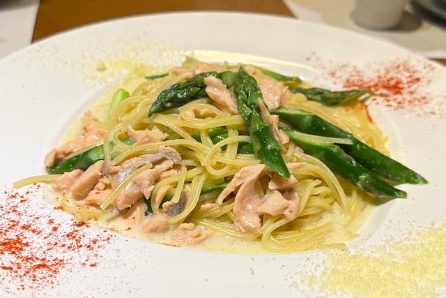 4.フライパンにオリーブ油を入れ、ニンニクを入れ香りをつけ、鮭、アスパラを入れ、茹で汁を大さじ3ぐらいを入れる