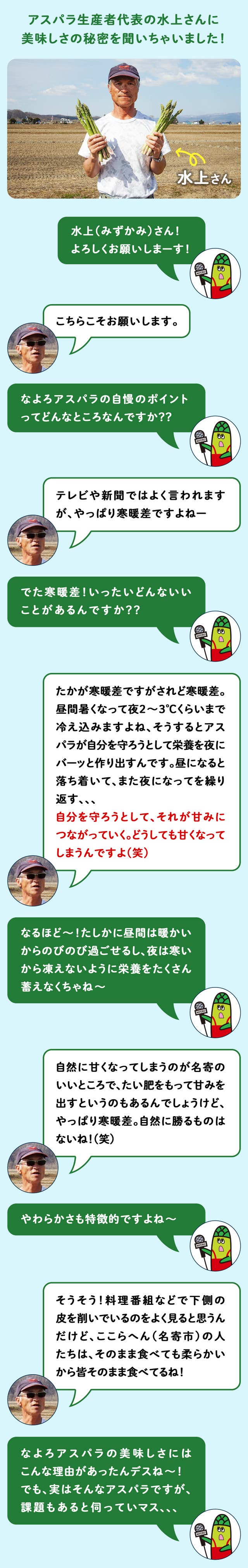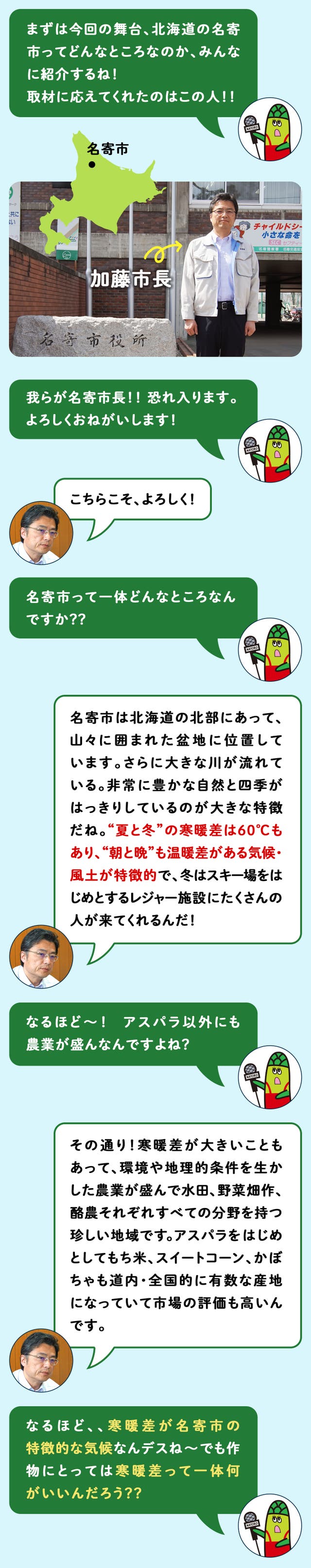 - 名寄市は北海道の中でも有数の盆地、寒暖差が大きい特有の気候が甘くて柔らかいアスパラガスを育む