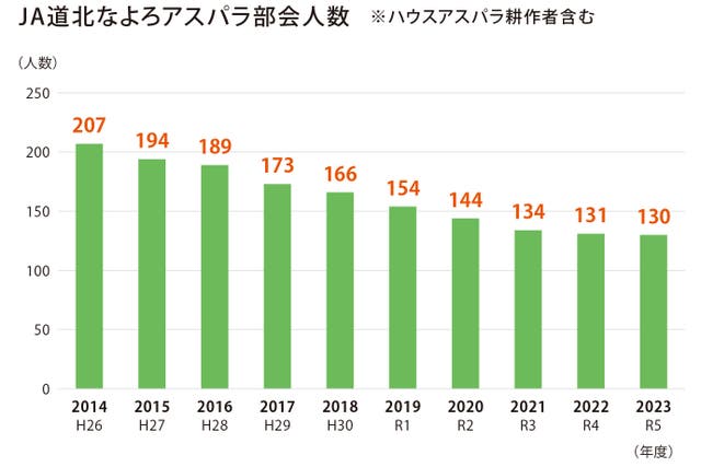 いまや日本各地の地方市町村がかかえる現実「人口減少」の問題が名寄市でも露見しています。農業の担い手不足も確実に迫っており、露地栽培のアスパラ農家さんは2014年の196戸から2024年115戸まで減少。(※上記グラフはハウスアスパラ含む)