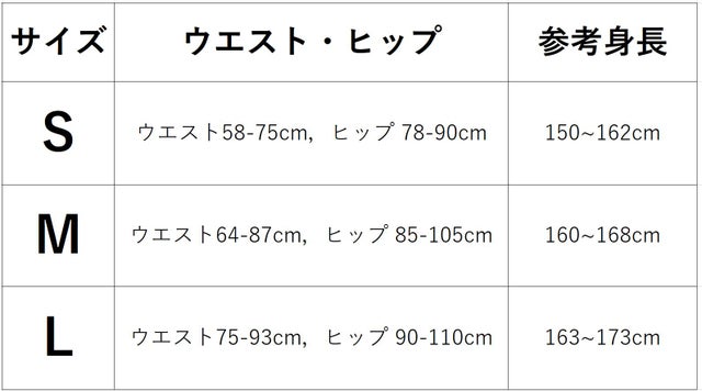 S:ウエスト58-75cm,ヒップ 78-90cm 参考身長150~162cm