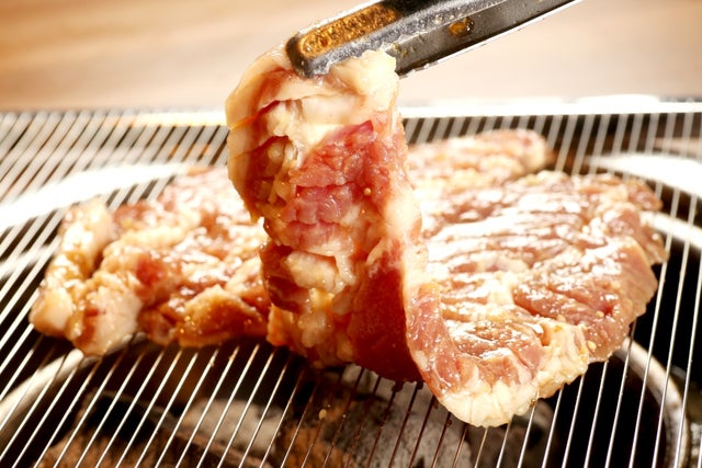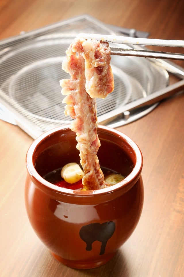 薄くスライスした牛カルビ肉を、事前に自慢のソースに漬け込んでいます。炭火でしゃぶしゃぶと軽く炙る程度に焼いて、白ネギとにんにく、野菜などを巻いてお召し上がりください。ソースの旨味がぎゅっと濃縮された口どけの良いしゃぶしゃぶのような柔らかい肉質。やみつきになる当店の看板メニューです!