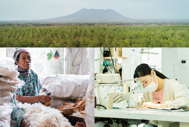 ▶︎カポック農園の様子と、カポックの加工工場で働く女性。右下はインドネシアの大学研究員ヌリンダさん。