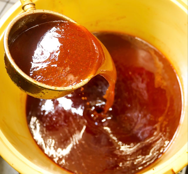 よっぴーの唐揚げは、お肉を漬け込む秘伝のタレ作りから始まります。 九州でお馴染みの「淡口醤油」をベースに、「門外不出」のレシピ…何種類ものスパイスや果物、ごま油などを加え、さらにコクや旨みを増すため、出来上がったタレは熟成するまで寝かせます。