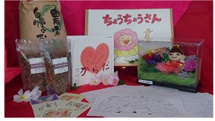 絵本紙芝居・ぬり絵10枚・ポストカード5枚・もち麦2袋・玄米5kg・鬼子母神人形