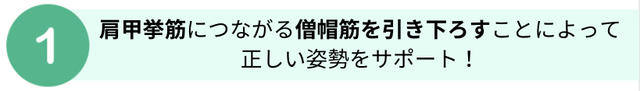 肩甲挙筋につながる僧帽筋を引き下ろすことによって肩への負担を減らしながら正しい姿勢がキープできます。