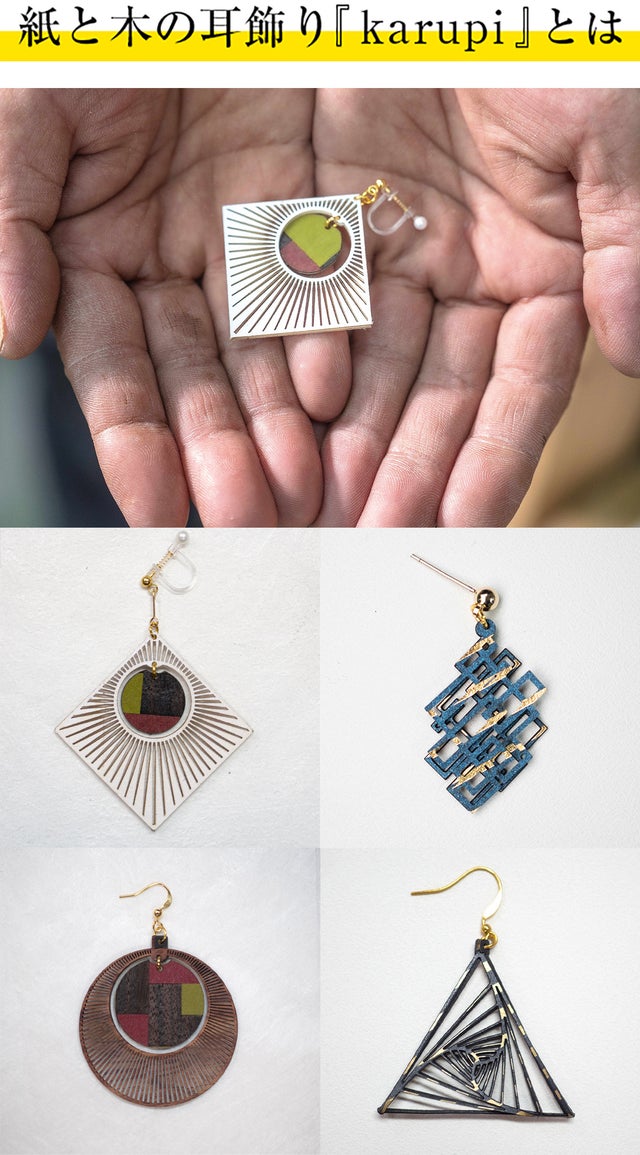 名前の通り、自然由来の材料である”紙”と”木”を主材料とした軽いピアス、イヤリングが『karupi』です。紙ならではの軽さと、他の素材では難しい独創的デザインで幅広い層の方に支持していただいています。
