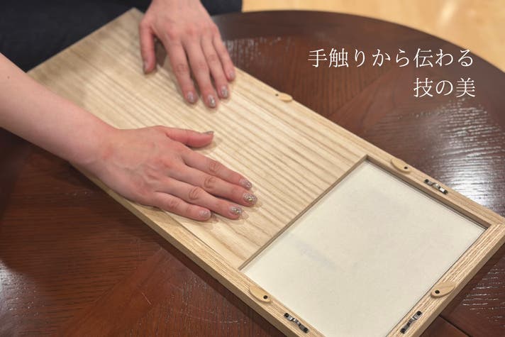 作品の背面には、桐箪笥職人の手によって、緻密に加工された桐の板を使用。作品を収める際にも、その手触りと技の緻密さを感じていただけるようになっています。