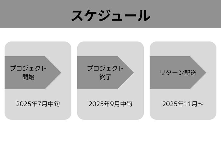 A. 応援購入いただいた順に、2025年11月中旬より順次発送を開始いたします(1点ずつ手作業で仕立てるため、最大で3ケ月ほどお時間をいただく場合がございます)。