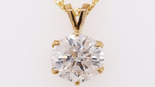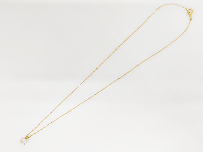 ①ダイヤモンド1ct(Hカラー・I1クラス・フェアカット)、ペンダント枠:K24(純金)約0.5g、チェーン(造幣局刻印入り):K24(純金)約1g、ペンダントヘッドのサイズ:約9×6.3㎜、チェーン長さ:約42㎝(約3cm部分にアジャスター管)、品質保証書、鑑定書、ネックレスケース付き