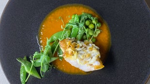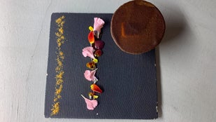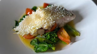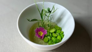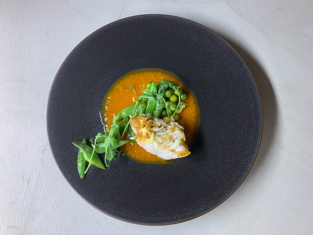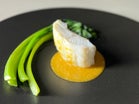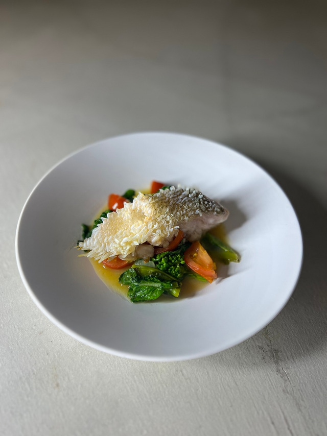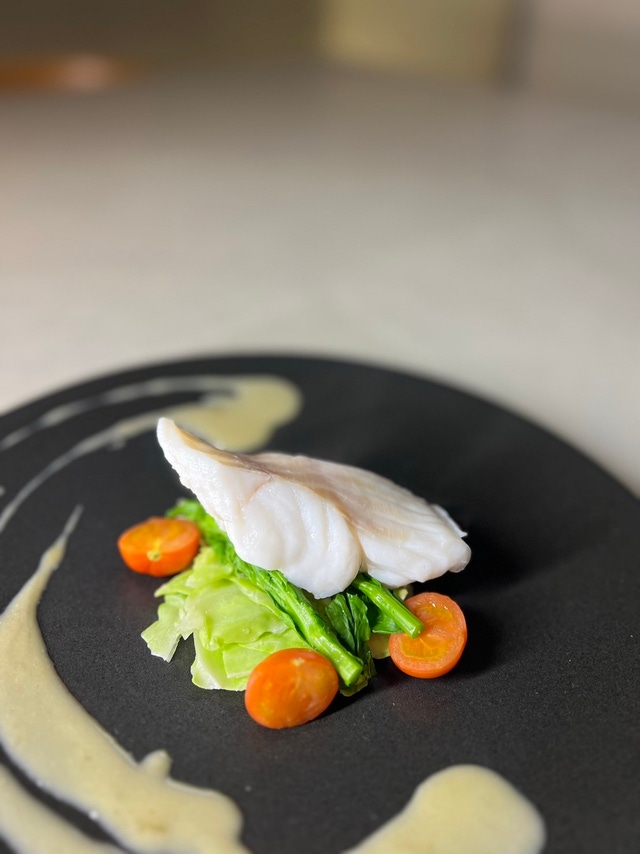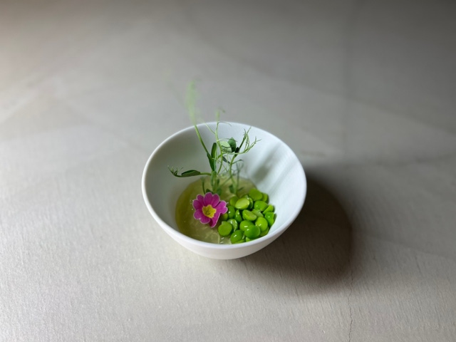 雉羽太と春のお野菜をスチームにかけて、ブールブランをベースに白味噌を合わせて仕上げた”和と洋の融合”