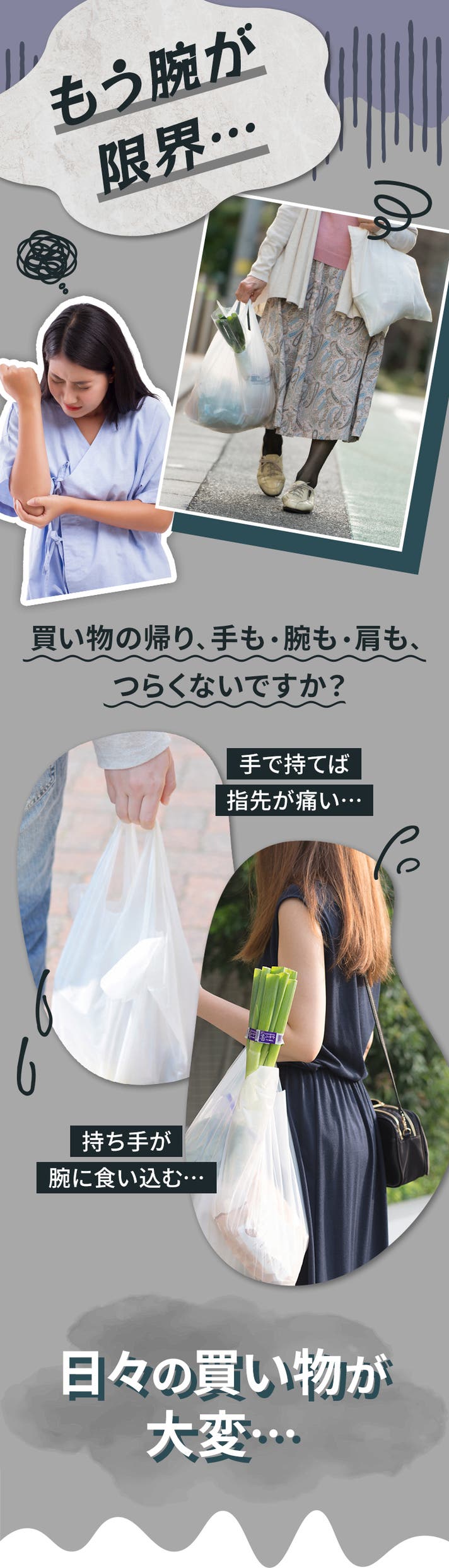 買い物帰りの重たい荷物で、腕や指が痛くなることはありませんか?手で持つと指が痛い、持ち手が腕に食い込む…。毎日の買い物が意外と大きな負担になっています。
