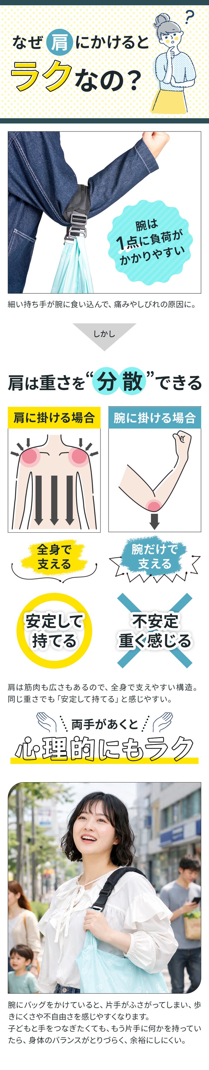 腕で荷物を持つと、細い持ち手が腕に食い込み一点に負荷が集中しやすくなります。一方、肩にかけると重さを全身に分散できるため安定して持つことができ、同じ荷物でも軽く感じやすくなります。両手が空くことで歩きやすく、心理的にもラクに感じられます。