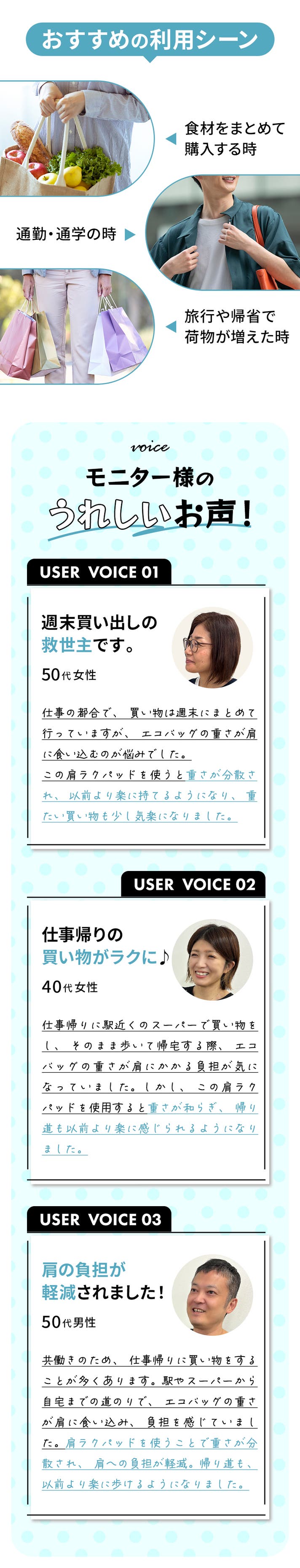 食材をまとめて購入する買い物の時や、通勤・通学、旅行や帰省など荷物が増えるさまざまなシーンで活躍します。実際のモニターからも「週末の買い出しがラクになった」「仕事帰りの買い物が快適になった」「肩への負担が軽減された」など、重たいエコバッグの持ち運びが楽になったという声が寄せられています。日常の買い物や外出時の負担を減らし、快適に荷物を持ち運べるアイテムです。