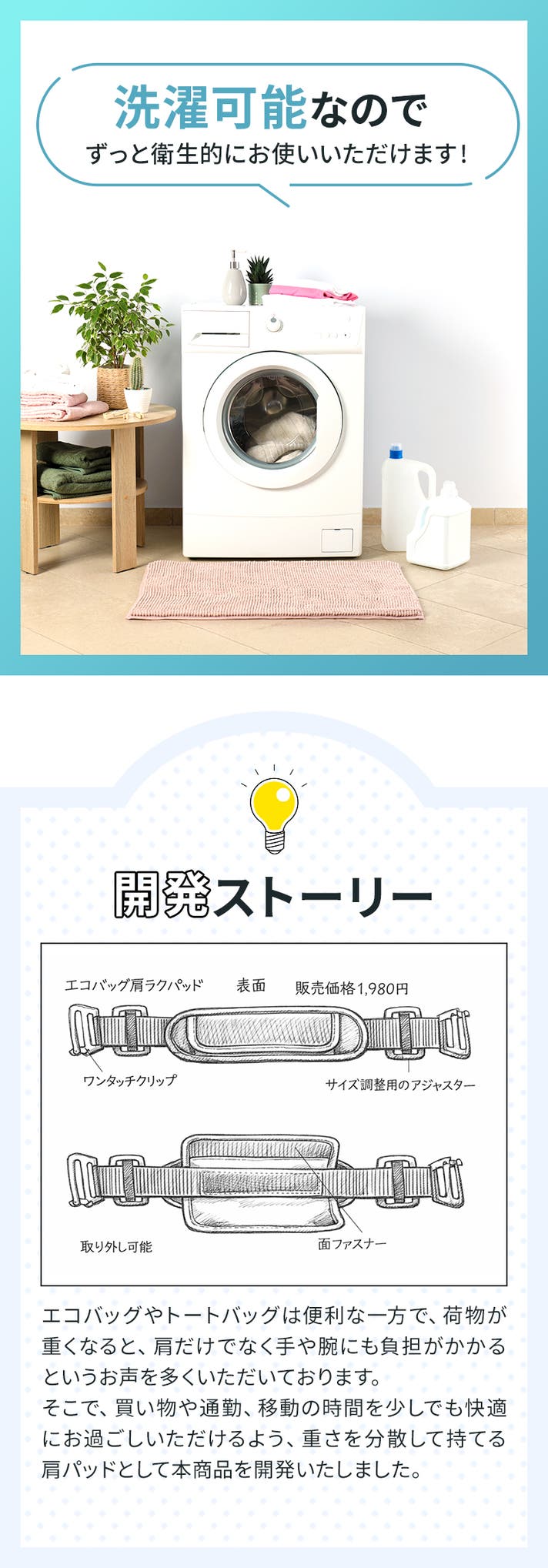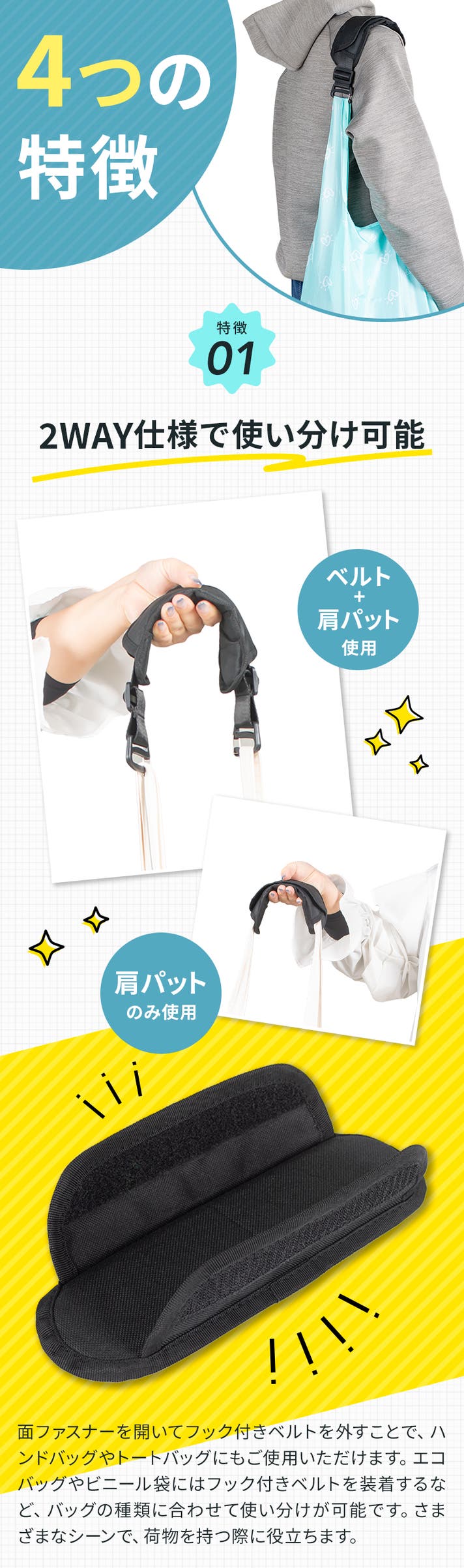 さらに、肩パッド単体でもベルト付きでも使える便利な2WAY仕様。バッグの持ち手に装着するだけで簡単に使えるため、普段使いのトートバッグやエコバッグにも対応します。