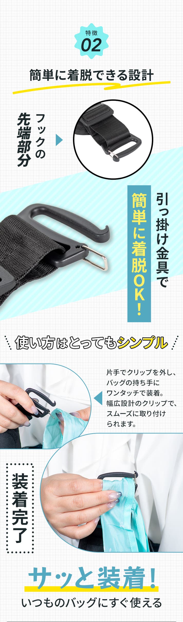 引っ掛け金具付きのクリップで、バッグの持ち手に簡単に装着できる設計。片手でクリップを外し、ワンタッチで取り付けられるため、誰でもスムーズに使えます。サッと装着でき、いつものバッグやエコバッグにもすぐ使える便利な仕様です。
