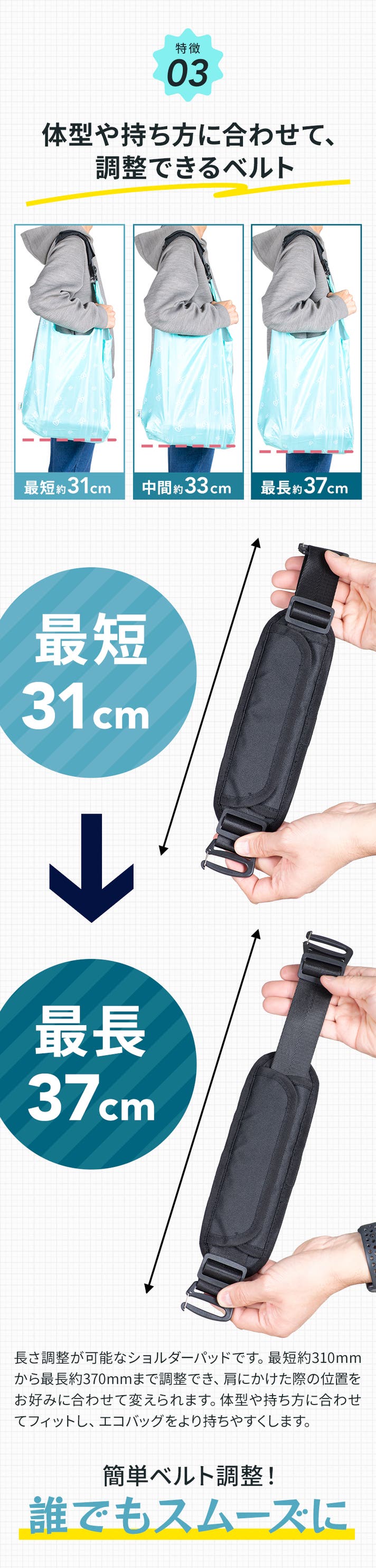 体型や持ち方に合わせてベルトの長さを調整できるショルダーパッド。約31cm〜37cmまで調整可能で、肩にかけたときの位置を好みに合わせて変えられます。自分に合った長さに調整することで、エコバッグや手持ちバッグをより快適に持ち運べます。