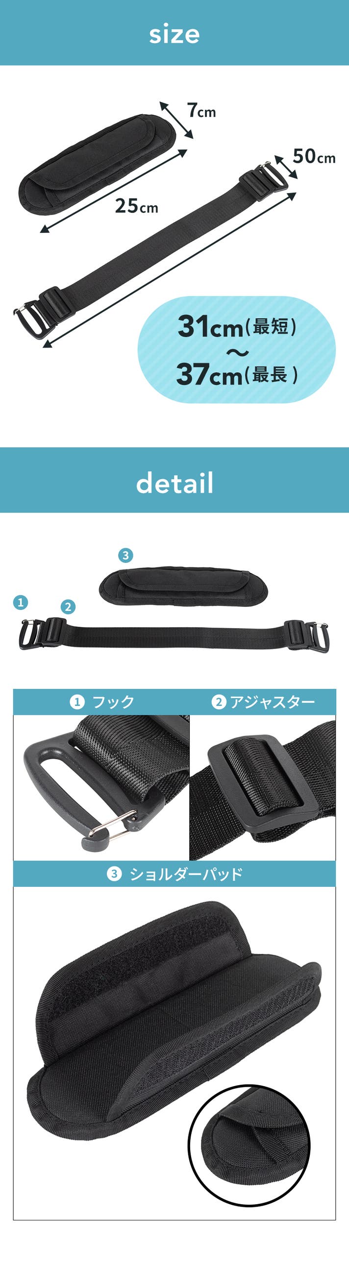 ショルダーパッドは長さ約310〜370mmまで調整可能。フック・アジャスター・ショルダーパッドの3つのパーツで構成され、バッグの持ち手に取り付けて快適に荷物を持ち運べる設計です。