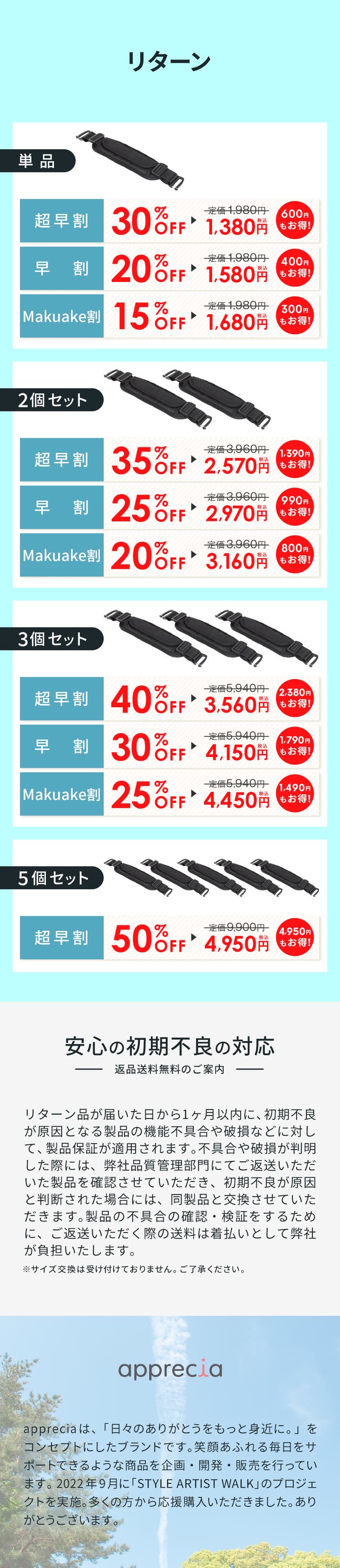 本商品は単品・2個・3個・5個セットのリターンを用意し、最大50%OFFの割引価格で購入可能。超早割・早割・Makuake割など段階的な割引があり、まとめ買いほどお得になります。また、初期不良には返品送料を含めて対応する安心のサポート付きです。