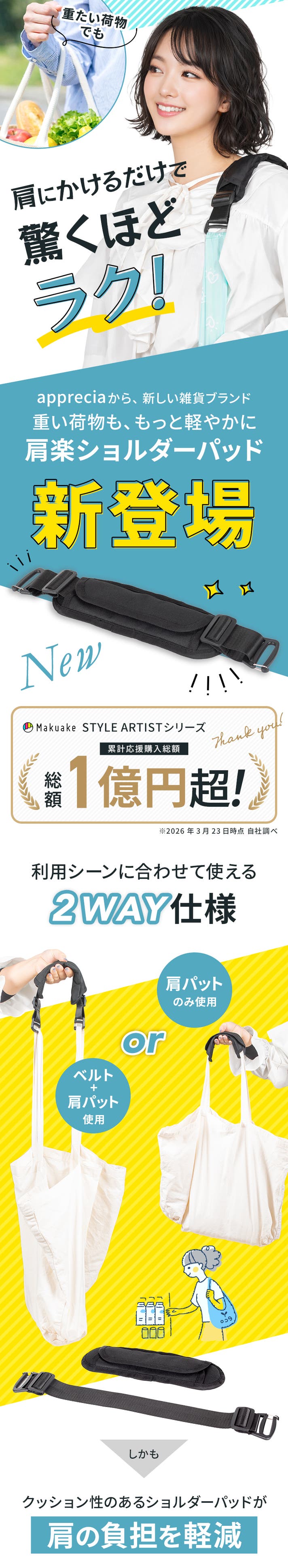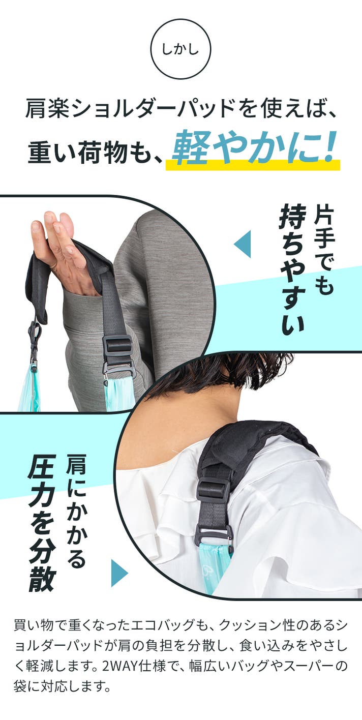 重たい荷物をもっとラクに。日々の買い物や外出を快適にする肩楽ショルダーパッドです。