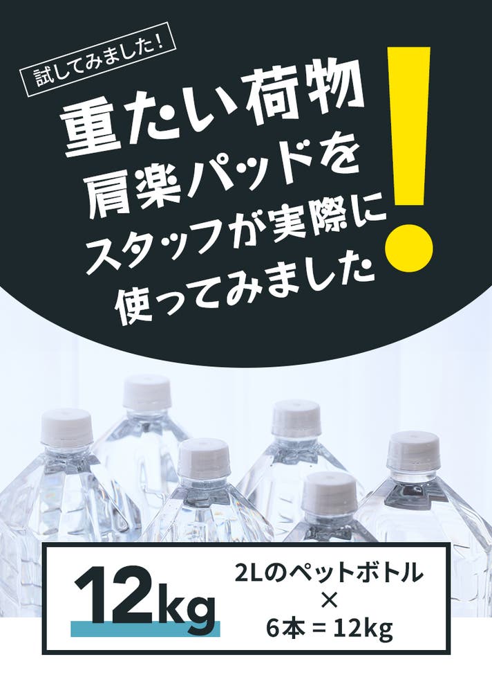 約12kg(2Lペットボトル6本分)の重たい荷物でも、肩楽ショルダーパッドを使うことで持ちやすさが大きく変わります。肩への負担を分散し、重たい荷物もラクに持ち運べます。