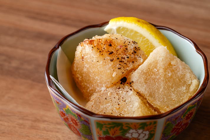 秘伝の出汁でじっくり炊き上げた大根をからりと揚げ、トリュフ塩で召し上がっていただきます。