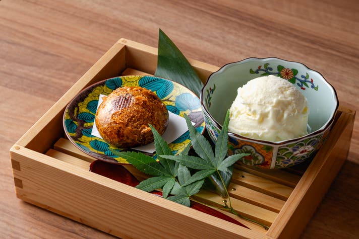 デザートには福井老舗御素麺屋のかりんとう饅頭と、濃厚抹茶アイスを。
