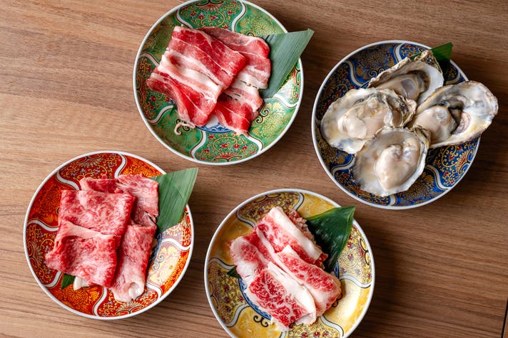 野菜盛り合わせ、豚バラ、牡蠣しゃぶ、和牛バラ、和牛サーロインの順番でお出しします。